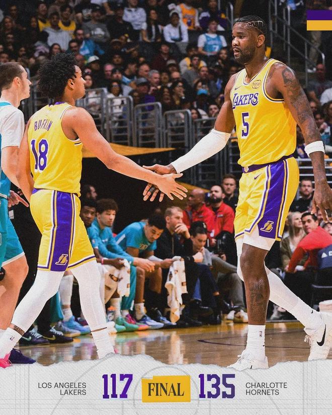 湖人替补球员只得到9分,文森特7中0,八村塁4中1。东契奇空砍39分3板4助、詹姆斯29分9板6助2断。他俩合砍68分,占了全队一半多。过去五场比赛,湖人只有1胜4负,先后输给马刺、雄鹿、国王和黄蜂,仅赢了老鹰一场。