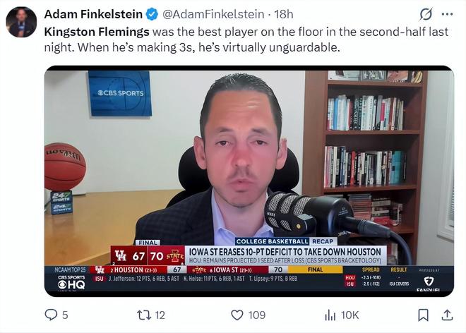 根据NCAA选秀专家Adam Finkelstein对弗莱明斯的评价:对阵爱荷华州立比赛就能看出弗莱明斯是场上最出色的那个,当他能命中三分球时几乎是无人可挡的。