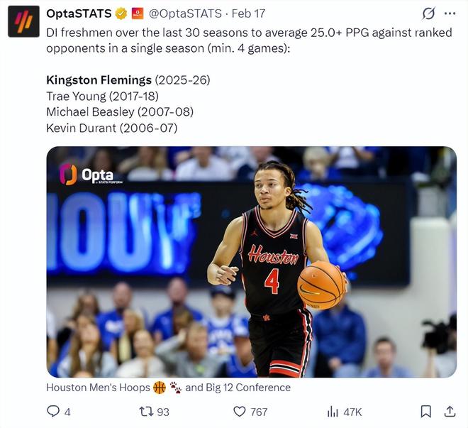 根据数据媒体OptaStats的消息,在过去30个赛季中,大一新生在对阵联盟排名靠前球队时能场均达到25分的球员只有特雷杨17-18、比斯利07-08赛季、杜兰特06-07赛季、弗莱明斯25-26赛季。