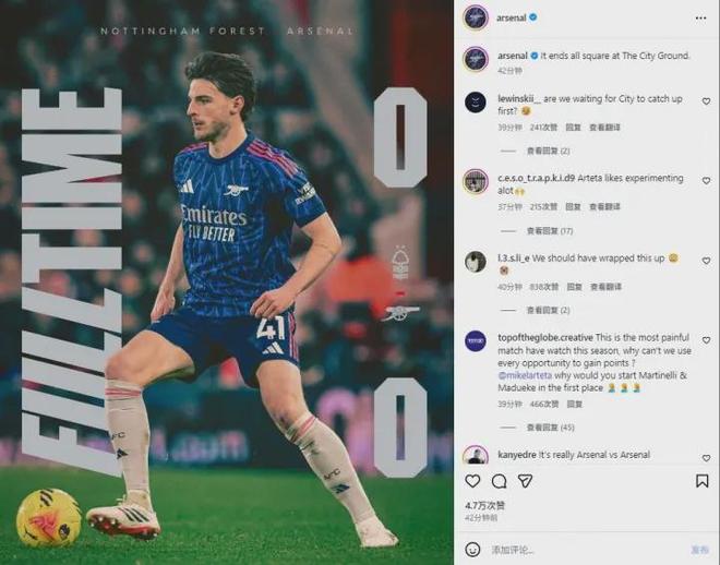 0-0!在曼城刚刚输掉曼市德比、拱手送上扩大领先优势的绝佳良机面前,阿森纳却在诺丁汉森林的铜墙铁壁前撞得头破血流。这是一场令人窒息的闷平,更是一场让枪手拥趸“心在滴血”的得势不得分。